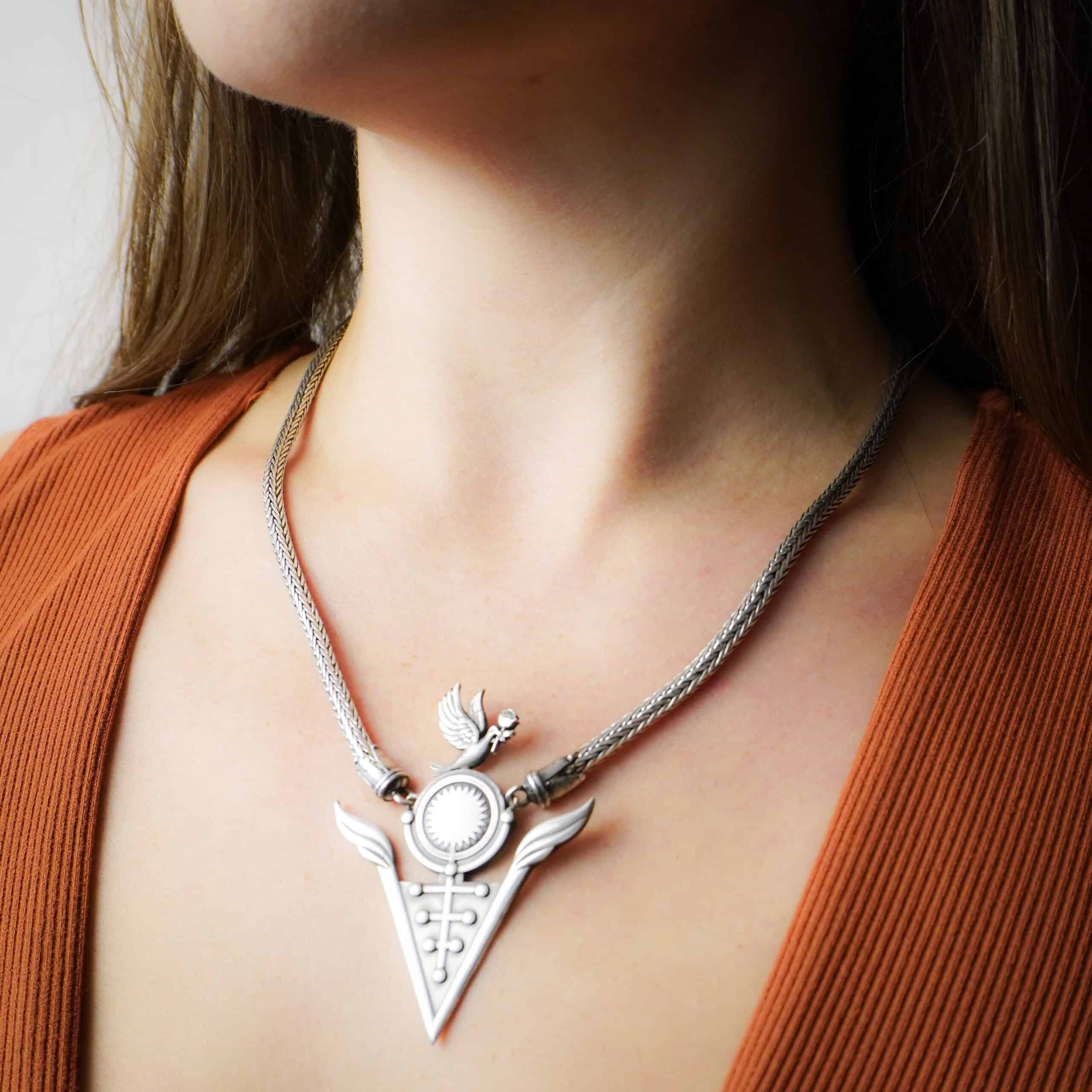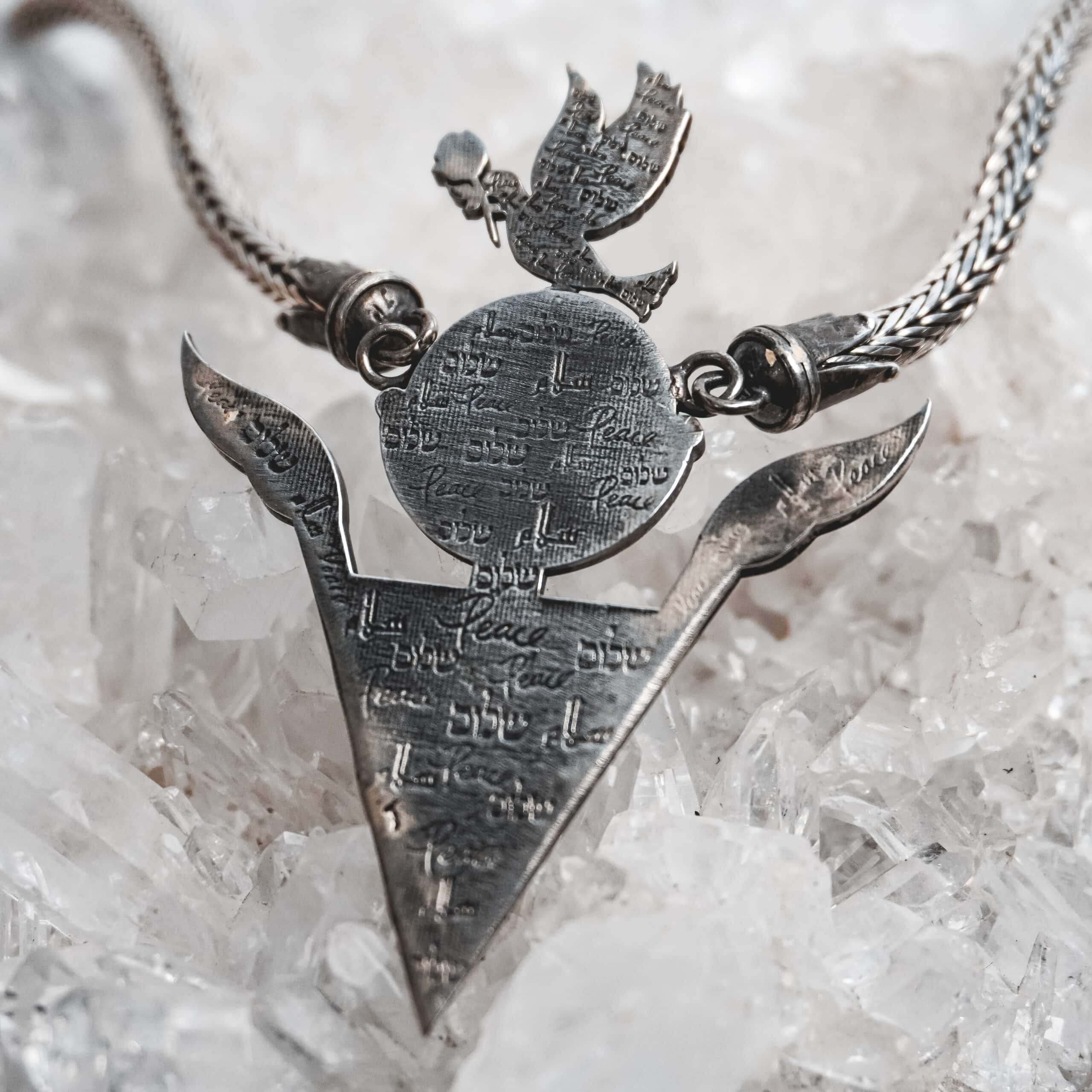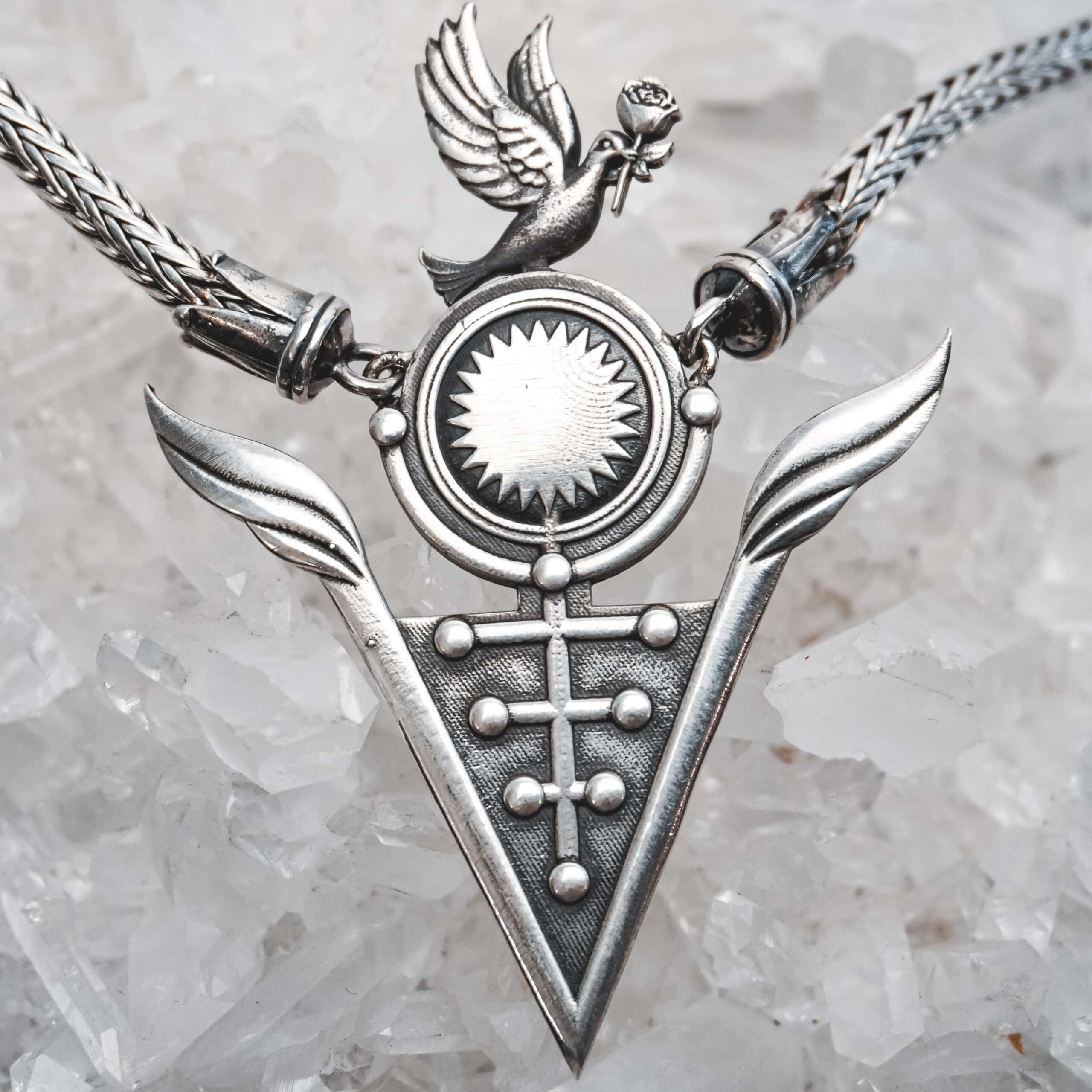 This elegant pendant showcases your choice of the Truth and Justice League logo size, featuring a dove and rose.